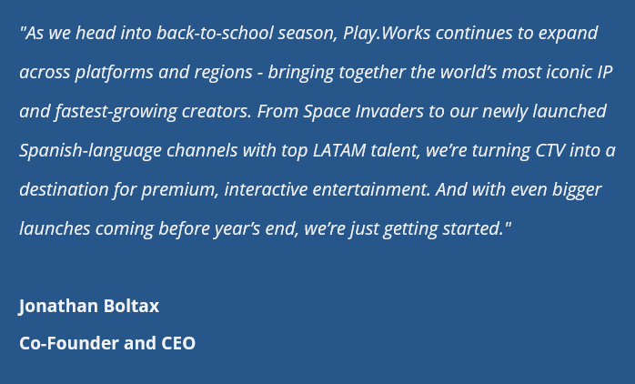 We’ve expanded our global footprint with the launch of four of LATAM’s biggest creators: Juan De Dios Pantoja, Karla Bustillos, Mau McMahon, and Cesar Pantoja. Their content, spanning music, lifestyle, and comedy, is now available free across the Play.Works network, helping expand our reach with Spanish-speaking audiences on Connected TV.
